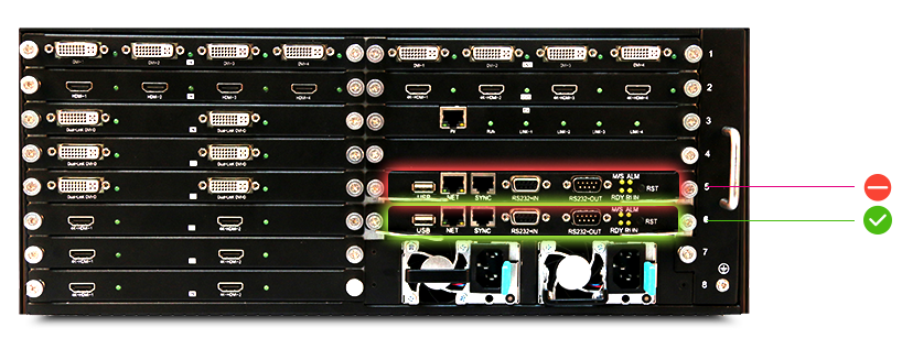 支持主控卡熱備的拼接處理器,故障自動切換。即使主備控制卡同時拔出, 系統仍可按原狀態運行。