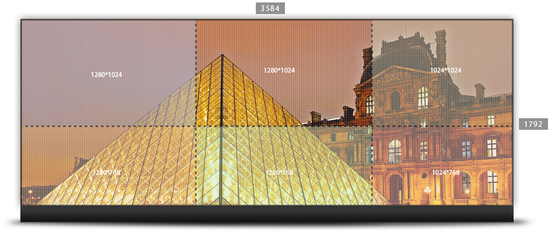 單臺(tái)設(shè)備支持不少于4組不同分辨率的拼接屏,不同組屏間信號(hào)共享,系統(tǒng)精簡(jiǎn)、管控便捷。