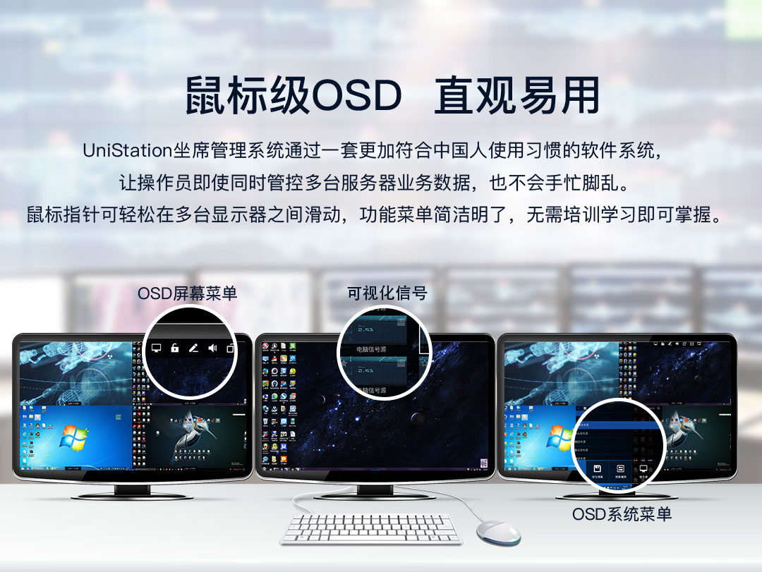 UniStation坐席管理系統(tǒng)可使操作員擺脫于多臺(tái)顯示器間的來(lái)回移動(dòng),在一個(gè)工作臺(tái)上,通過(guò)一套鍵盤(pán)鼠標(biāo)即可對(duì)多臺(tái)服務(wù)器進(jìn)行管控。