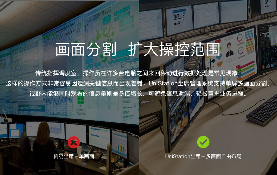 UniStation坐席管理系統(tǒng)支持畫(huà)面分割,單屏可實(shí)現(xiàn)4畫(huà)面,擴(kuò)大視野內(nèi)的數(shù)據(jù)信息顯示,不會(huì)因?yàn)槟承┬畔o(wú)法查看而導(dǎo)致出現(xiàn)差錯(cuò)。
