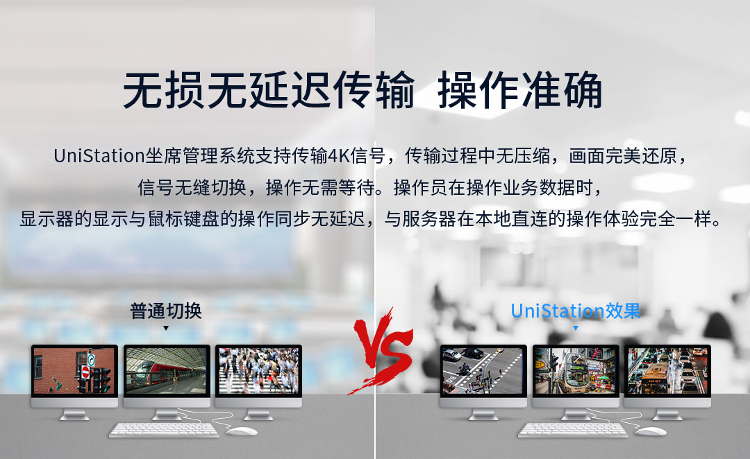 UniStation坐席管理系統(tǒng)支持傳輸4K信號(hào),傳輸過(guò)程中無(wú)壓縮,畫(huà)面真實(shí)還原,信號(hào)無(wú)縫切換,操作無(wú)需等待。操作員在操作業(yè)務(wù)數(shù)據(jù)時(shí),顯示器的顯示與鼠標(biāo)鍵盤(pán)的操作同步,與服務(wù)器在本地直連的操作體驗(yàn)一致。
