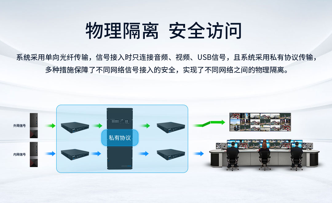 系統(tǒng)采用單向光纖傳輸,信號(hào)接入時(shí)只連接音頻、視頻、USB信號(hào),且系統(tǒng)采用私有協(xié)議傳輸,多種措施保障了不同網(wǎng)絡(luò)信號(hào)接入的安全,實(shí)現(xiàn)了不同網(wǎng)絡(luò)之間的物理隔離。
