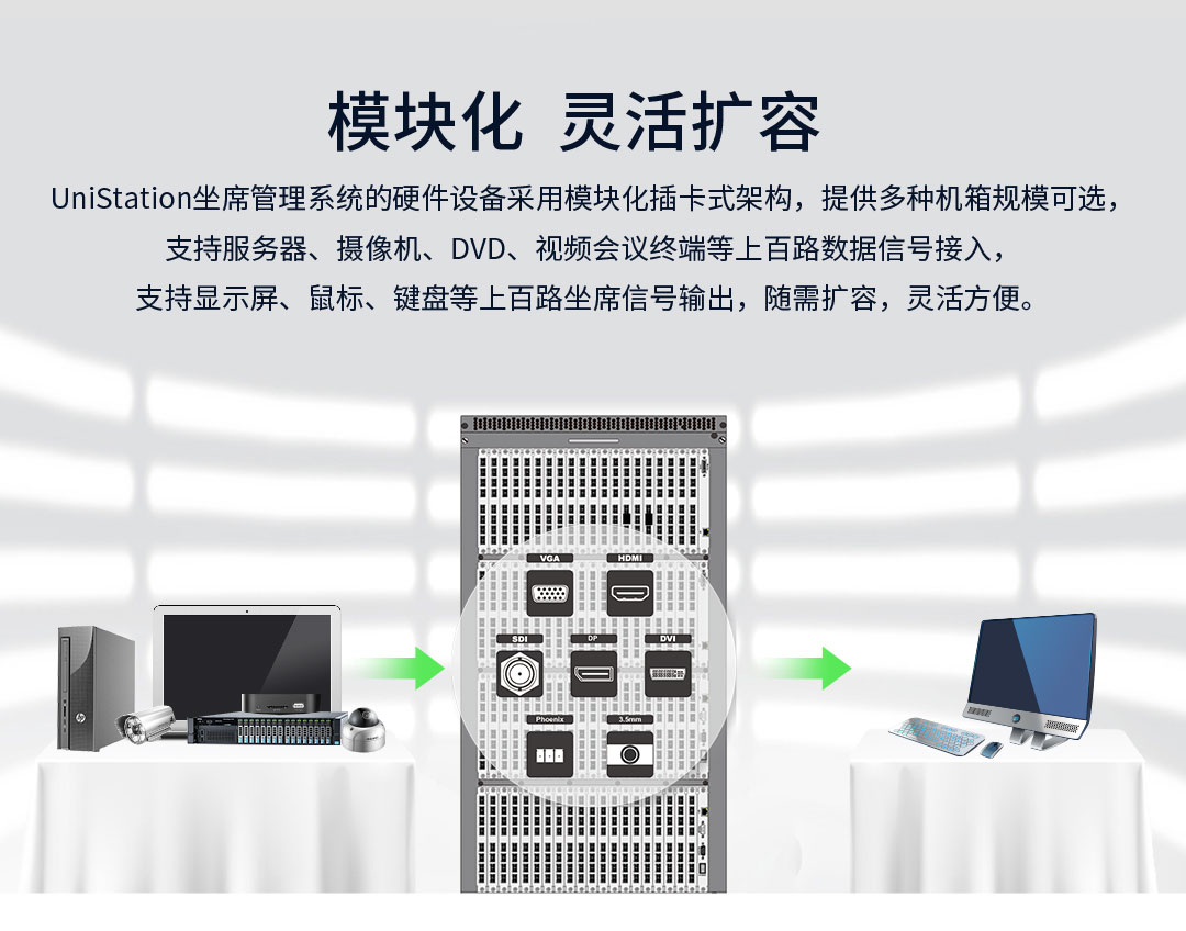 UniStation坐席管理系統(tǒng)的硬件設(shè)備采用模塊化插卡式架構(gòu),提供多種機(jī)箱規(guī)模可選,支持服務(wù)器、攝像機(jī)、DVD、視頻會(huì)議終端等上百路數(shù)據(jù)信號(hào)接入,支持顯示屏、鼠標(biāo)、鍵盤(pán)等上百路坐席信號(hào)輸出,隨需擴(kuò)容,靈活方便。